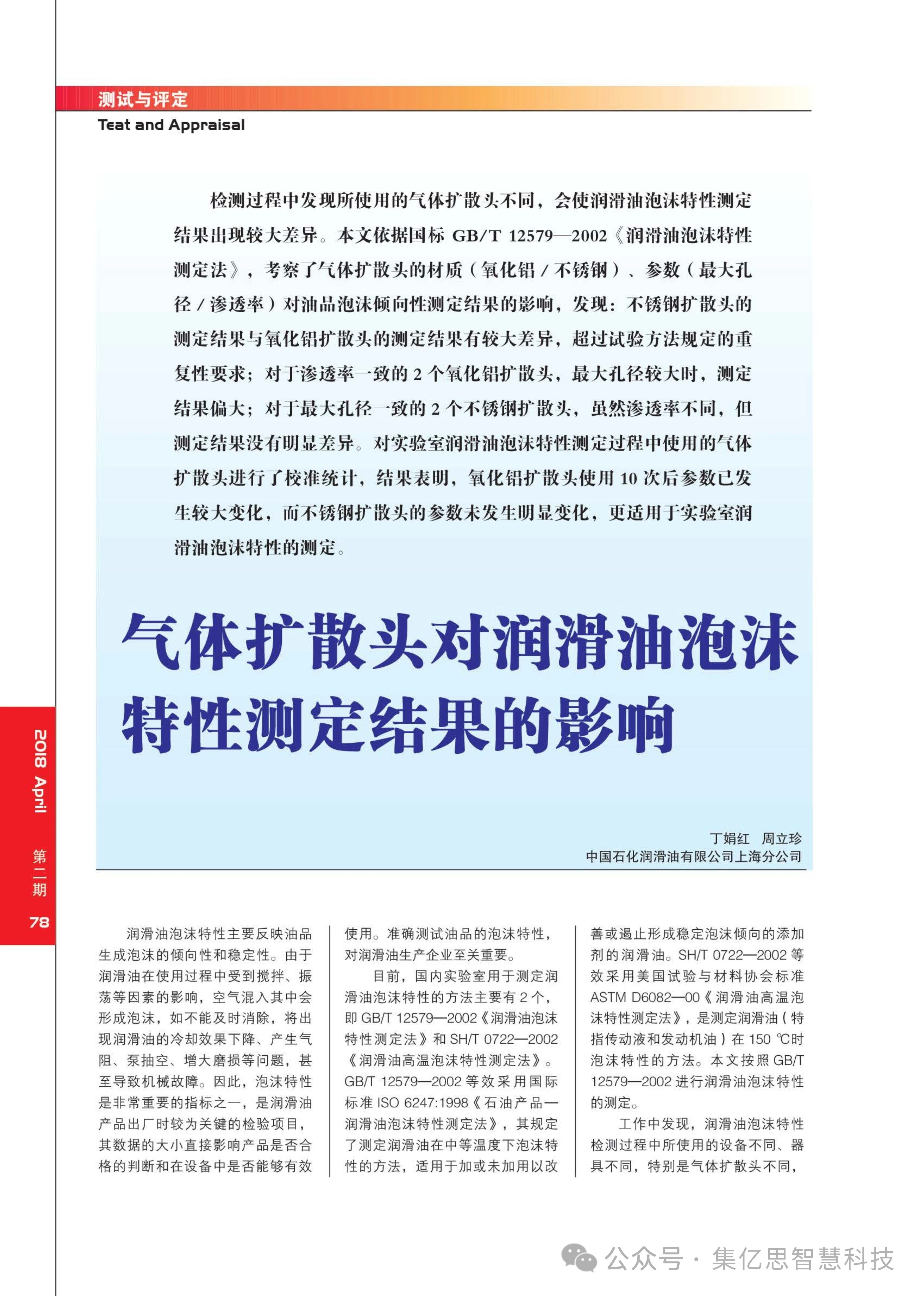 【好文分享】气体扩散头对润滑油泡沫特性测定结果的影响