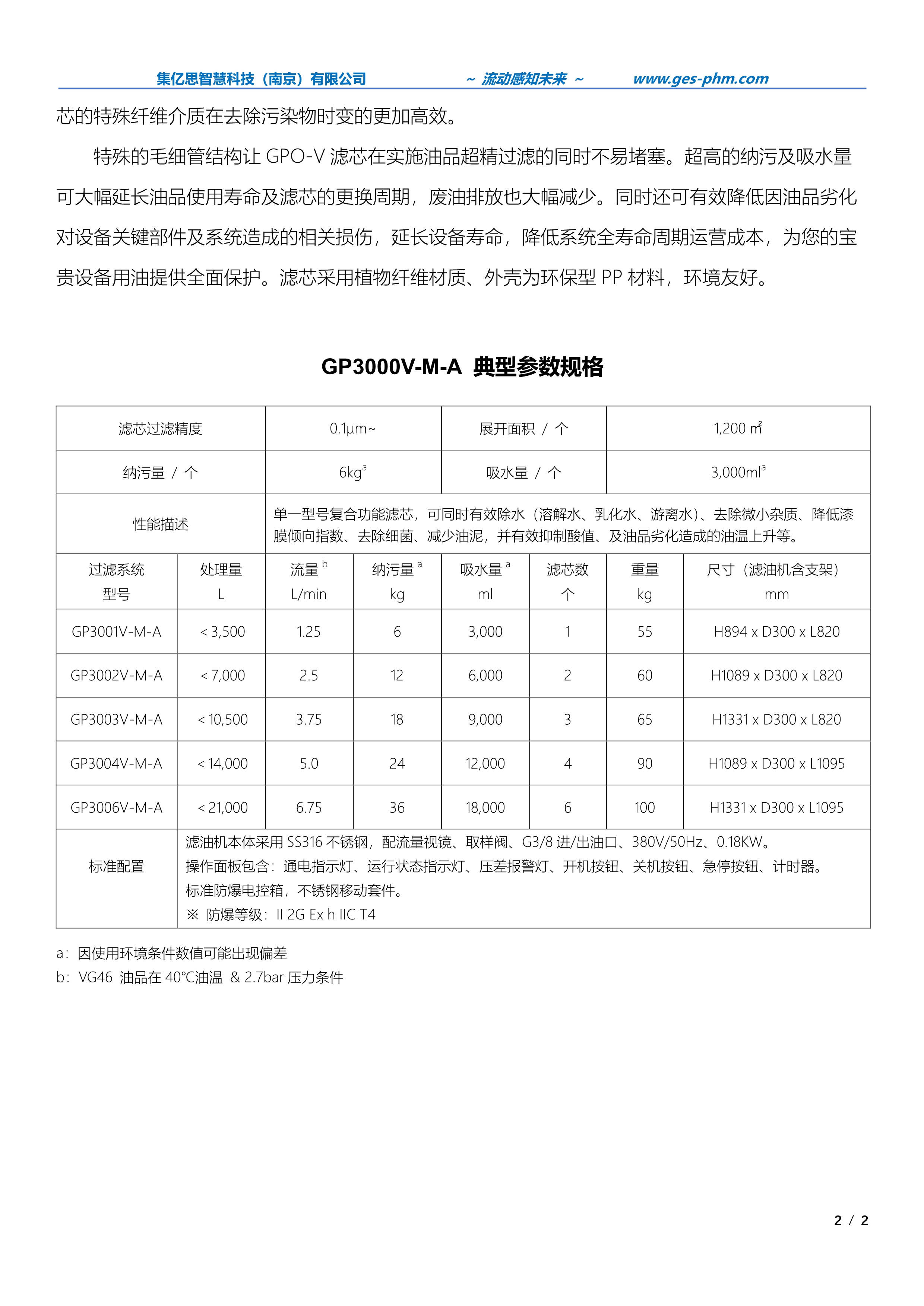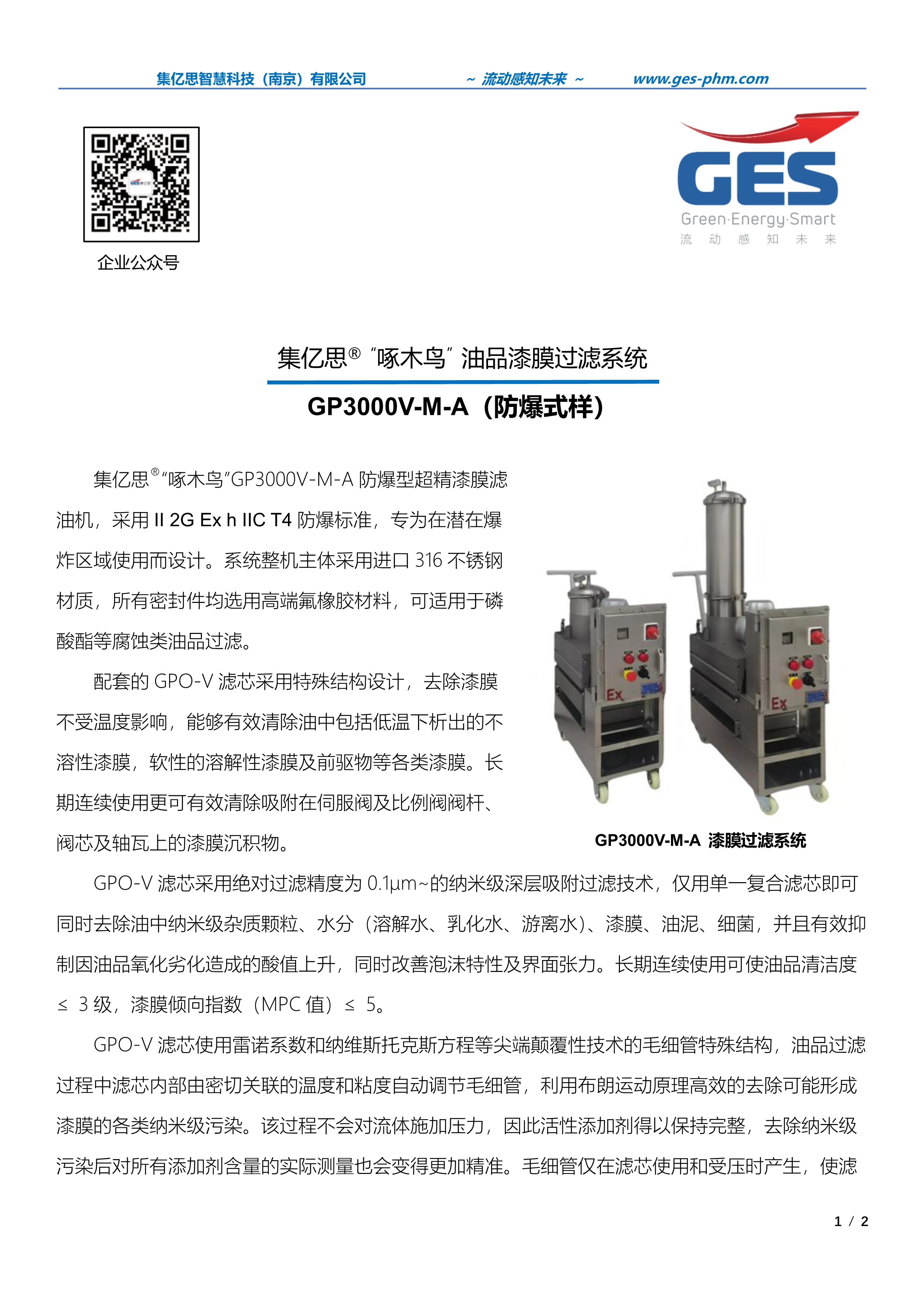 集亿思®“啄木鸟”GP3000V-M-A 防爆型超精漆膜滤 油机,采用 II 2G Ex h IIC T4 防爆标准,专为在潜在爆 炸区域使用而设计。系统整机主体采用进口 316 不锈钢 材质,所有密封件均选用高端氟橡胶材料,可适用于磷 酸酯等腐蚀类油品过滤。