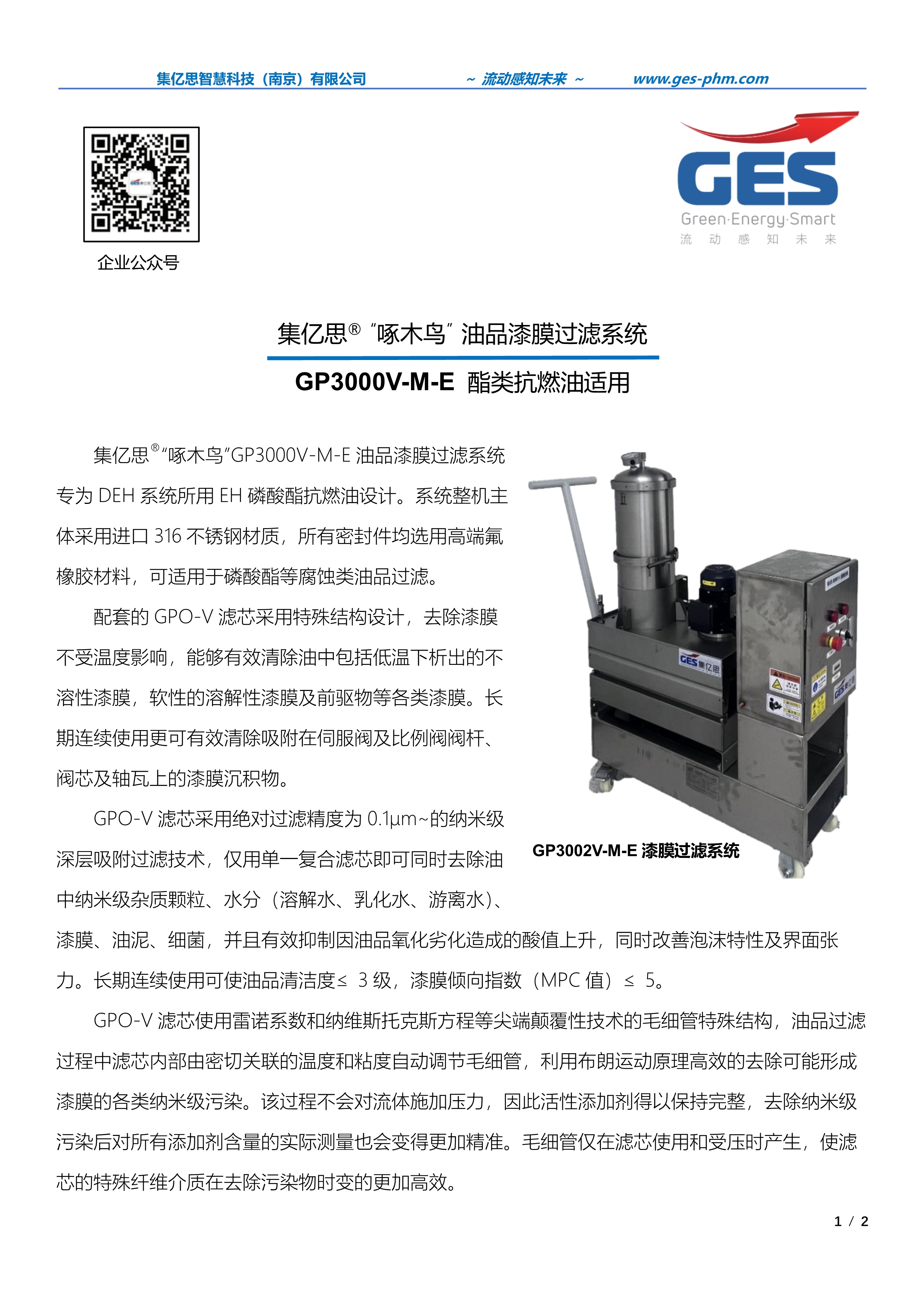 集亿思®“啄木鸟”GP3000V-M-E 油品漆膜过滤系统 专为 DEH 系统所用 EH 磷酸酯抗燃油设计。系统整机主 体采用进口 316 不锈钢材质,所有密封件均选用高端氟 橡胶材料,可适用于磷酸酯等腐蚀类油品过滤。